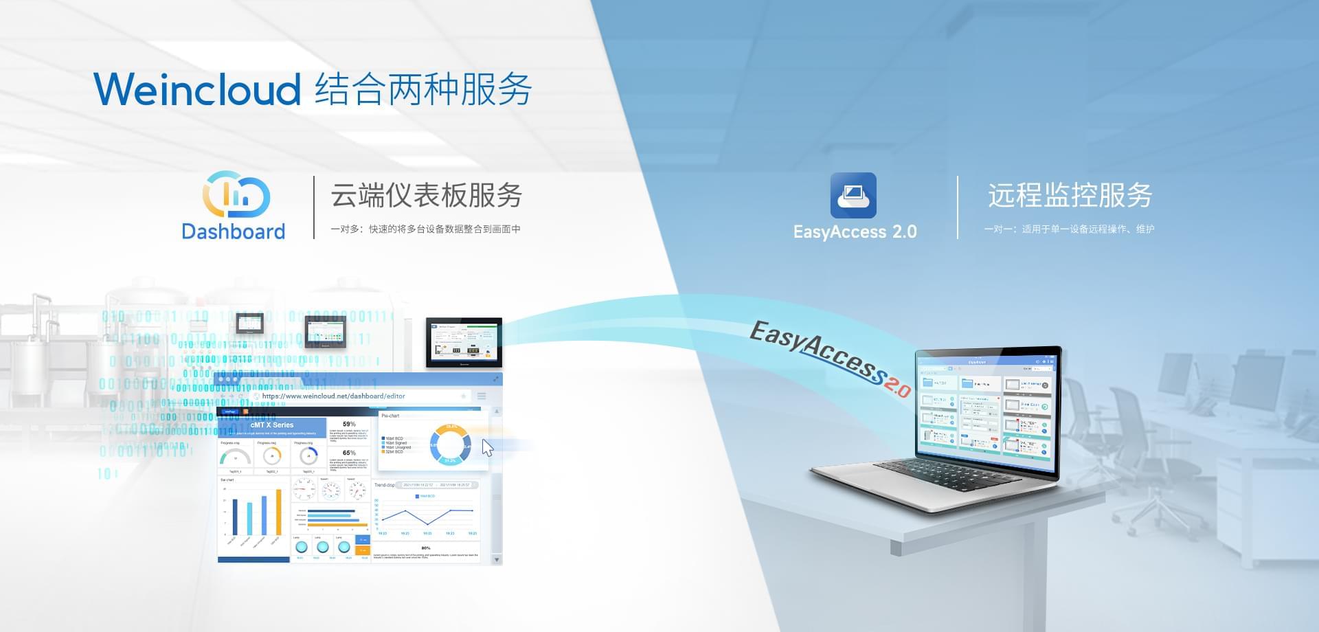 Weincloud 集結(jié)EasyAccess2.0遠(yuǎn)程監(jiān)控服務(wù)及Dashboard云端儀表服務(wù),將設(shè)備資料數(shù)據(jù)上云并以視覺化呈現(xiàn),協(xié)助管理者實(shí)時掌控現(xiàn)場產(chǎn)線狀態(tài)。